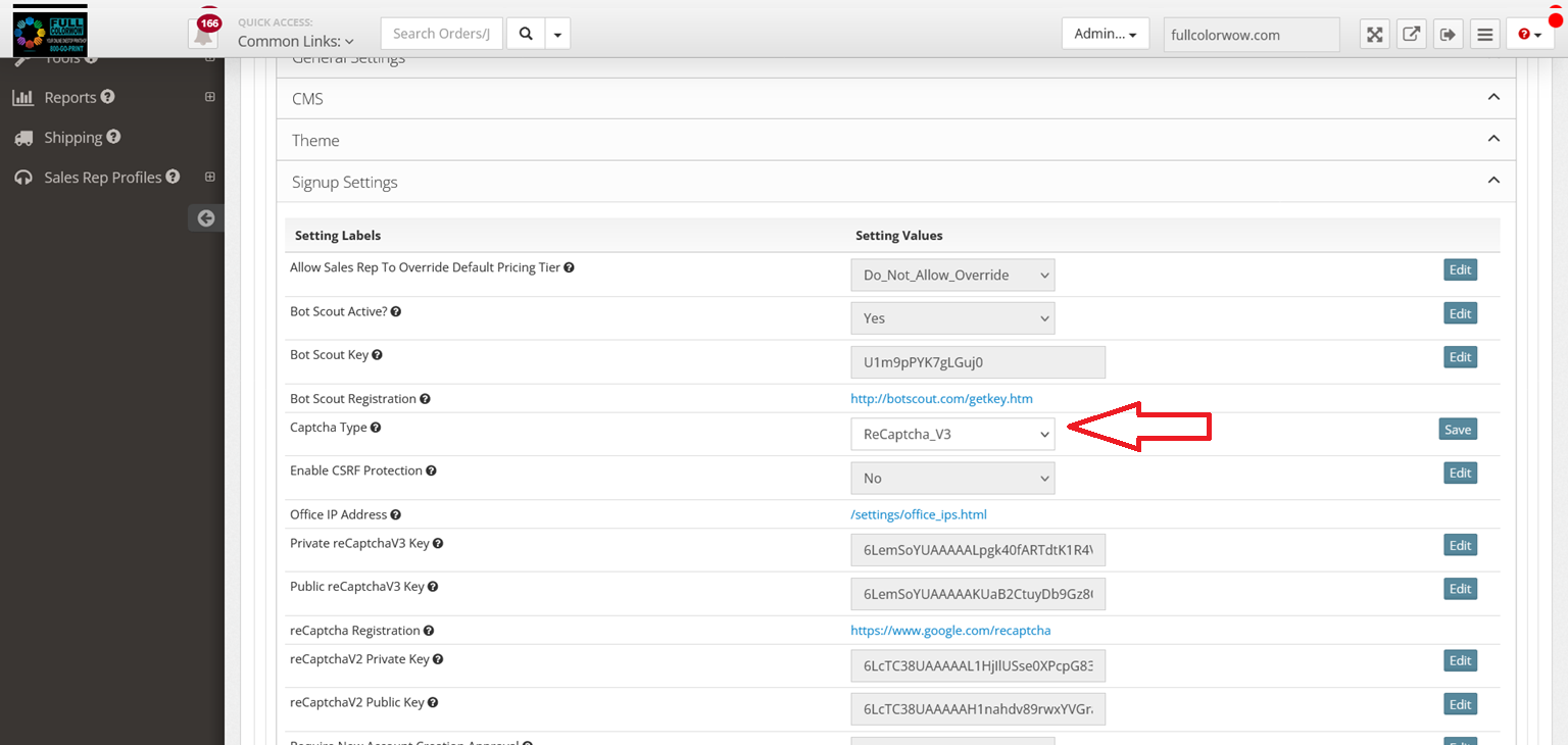- Locate setting "Captcha Type", click "Edit" and select "ReCaptcha_V3" , click Save