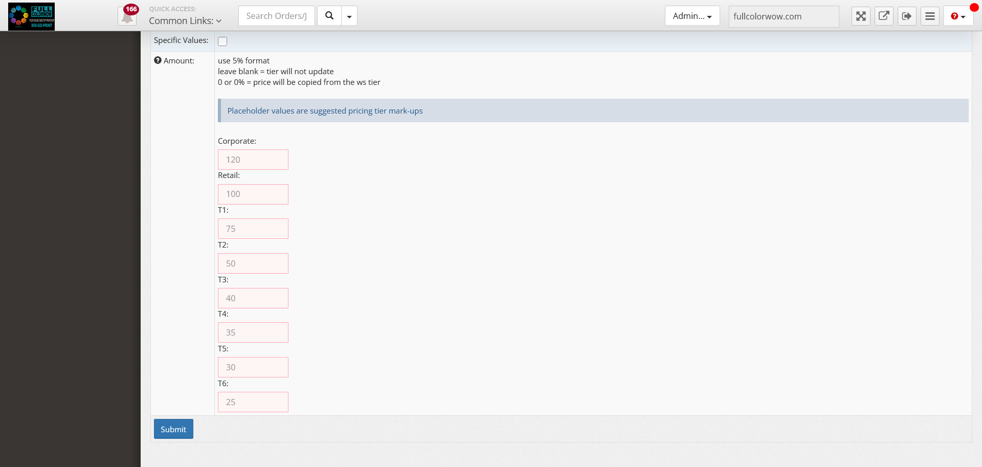 - Scroll down to Amount and enter mark up levels (Percentage: example: 100% is 100.00)