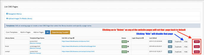 - If you want to revert a page back to its original content, you can disable or delete the modified page. Please note, this does not delete the page, it just deletes the modified content.