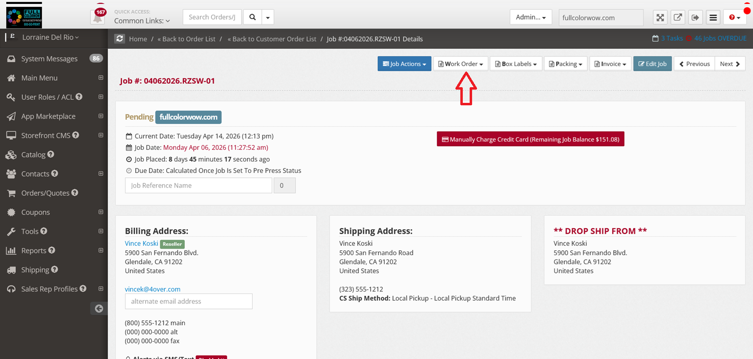 - Work Order tab → Print/download work orders & labels